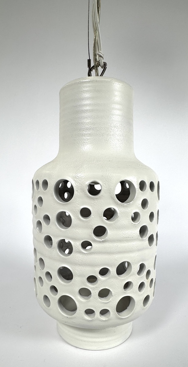 Witte keramische hanglamp in kenmerkende Space Age stijl, vervaardigd omstreeks 1970. Het cilindrische armatuur is rondom voorzien van een decoratief patroon met diverse ronde perforaties. Het ontwerp met een geribbelde hals en lichte glazuurlaag, toont sterke invloeden van West-Duits of Nederlands design uit de jaren zeventig.