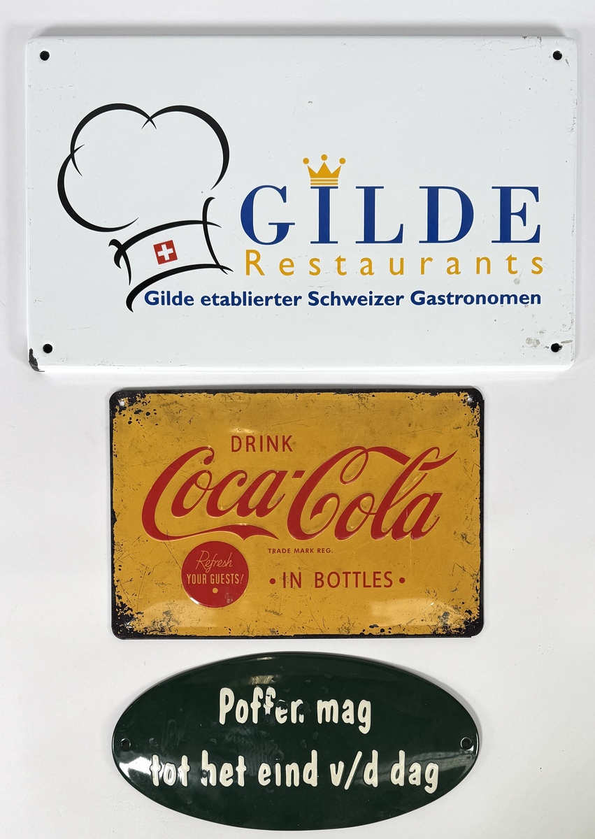 Een wit geëmailleerd gevelbord van Gilde Restaurants, groen emaille ovaal spreukbord en een geel blik reliëfbord van Coca-Cola, geproduceerd door Nostalgic-Art. Eind 20e eeuw.