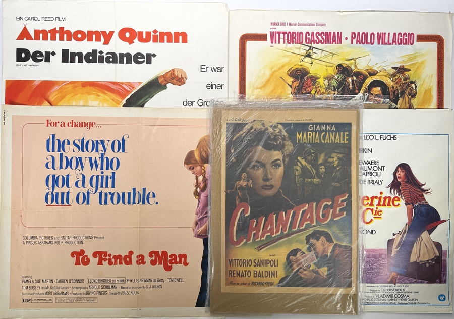 Diverse filmposters uit de jaren 1970, gedrukt in offsetlithografie. De collectie bevat affiches voor films als 'Catherine & Cie' met Jane Birkin, de spaghettiwestern 'Mais qu'est-ce que je viens foutre...?' van Sergio Corbucci en 'Der Indianer' met Anthony Quinn. De posters zijn van Belgische, Franse en Duitse herkomst en tonen diverse grafische stijlen, van geschilderde actiescènes tot popart fotografie.