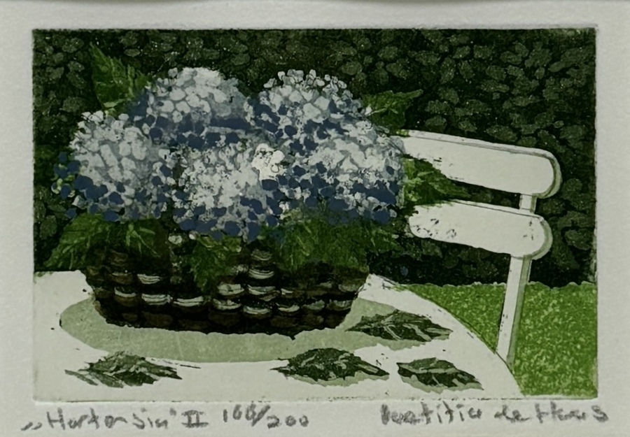 Kleurets op papier van Leatitia de Haas (1948, Voorburg), getiteld “Hortensia II”, oplagenummer 166/200 en gesigneerd in potlood rechtsonder. De figuratieve voorstelling toont een mand met blauwe hortensia’s op een tuintafel in een groene omgeving. De prent dateert uit de tweede helft van de 20e eeuw en bevindt zich in een goudkleurige lijst.
