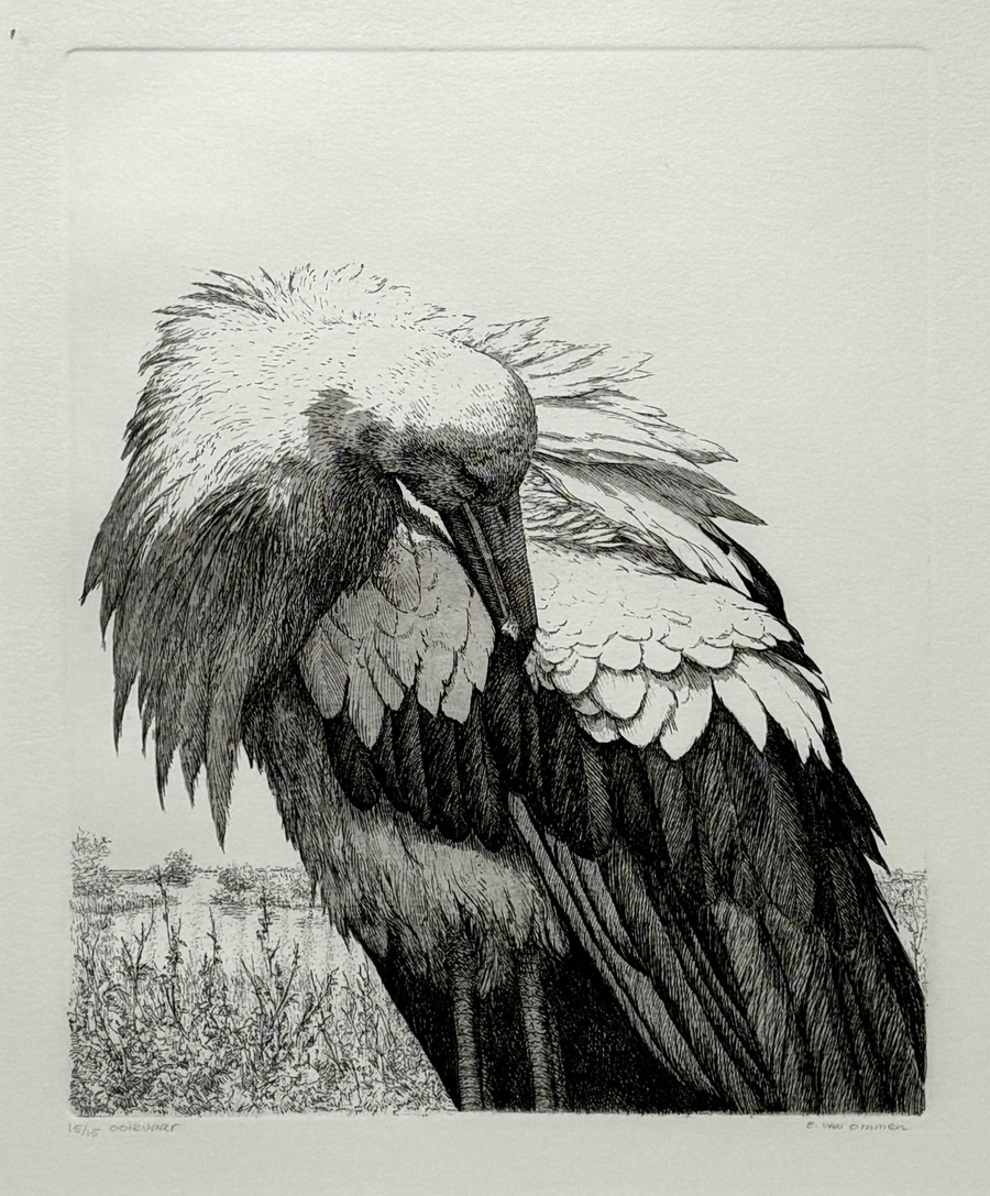Ets op papier van Erik van Ommen (1956) in naturalistische stijl, voorstellende een ooievaar met gebogen hals in rustige pose. Het werk is gesigneerd rechtsonder, getiteld en genummerd 15/15 linksonder. Kenmerkend zijn de verfijnde detaillering, contrastrijke arcering en ornithologische precisie. De compositie benadrukt de houding en structuur van de veren. Het werk bevindt zich in een houten lijst met passe-partout.