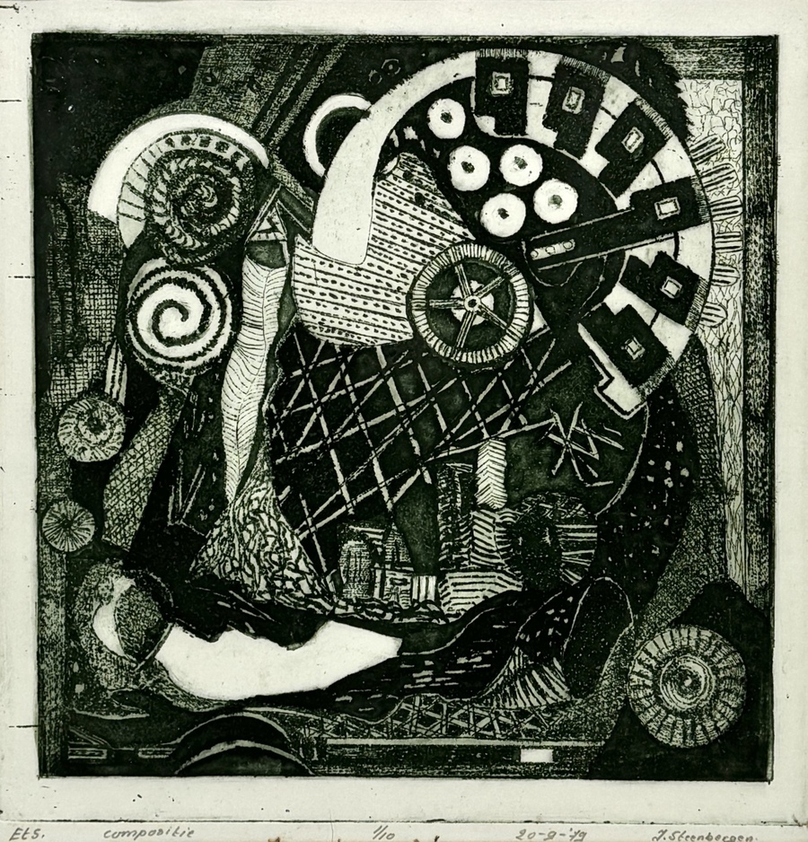 Ets op papier door Joop Steenbergen (1919–2000), 1979. Abstracte compositie in zwart met geometrische en organische vormen, opgebouwd uit spiraal- en rasterstructuren. Linksonder in potlood aangeduid: Ets. Compositie, genummerd 1/10, gedateerd 20-9-79 en gesigneerd J. Steenbergen rechtsonder. Expressieve lijnvoering en sterke contrastwerking. In passe-partout en witte lijst.