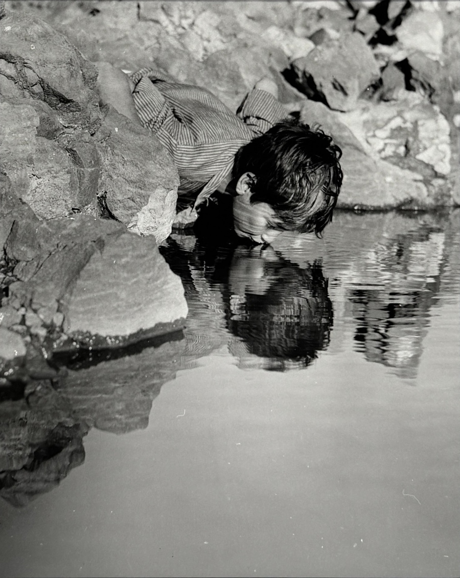 Zwart-witfoto op fotopapier van Dominique Darbois (1925–2014), ca. 1955–1965. De humanistisch-documentaire opname toont een jongen die drinkt uit een rotsig waterbekken, met zachte lichtval en spiegeling in het water. Originele zilvergelatine afdruk, gelijst in aluminium frame met passe-partout en TrueColor-label. Herkomst: Frankrijk, onder officieel copyright van de fotografe.