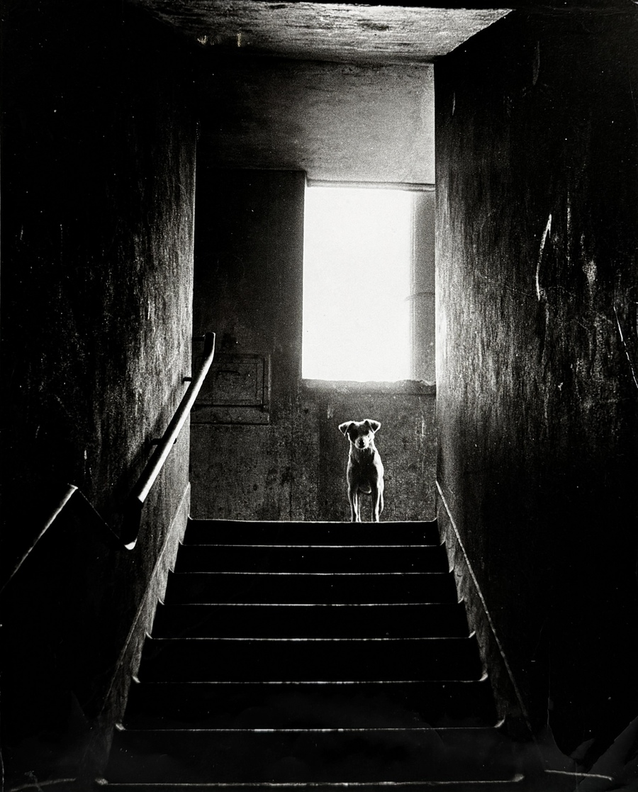 131. Zwart-witfoto, Jean Hermanson – hond op trap, tweede helft 20e eeuw