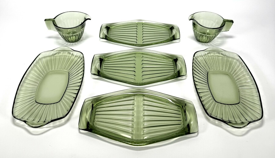 Fragment van een servies in lichtgroen persglas uit de serie “Neerlandia”, ontworpen door Andries Dirk Copier (1901–1991) voor Glasfabriek Leerdam, Nederland, jaren 1930. De geometrische vormen met waaierende ribbelstructuur zijn kenmerkend voor het modernistische Leerdam ontwerp uit de Art Deco periode. Bestaande uit drie langwerpige schalen, twee ovale schalen en twee schenkkannetjes in identieke uitvoering.