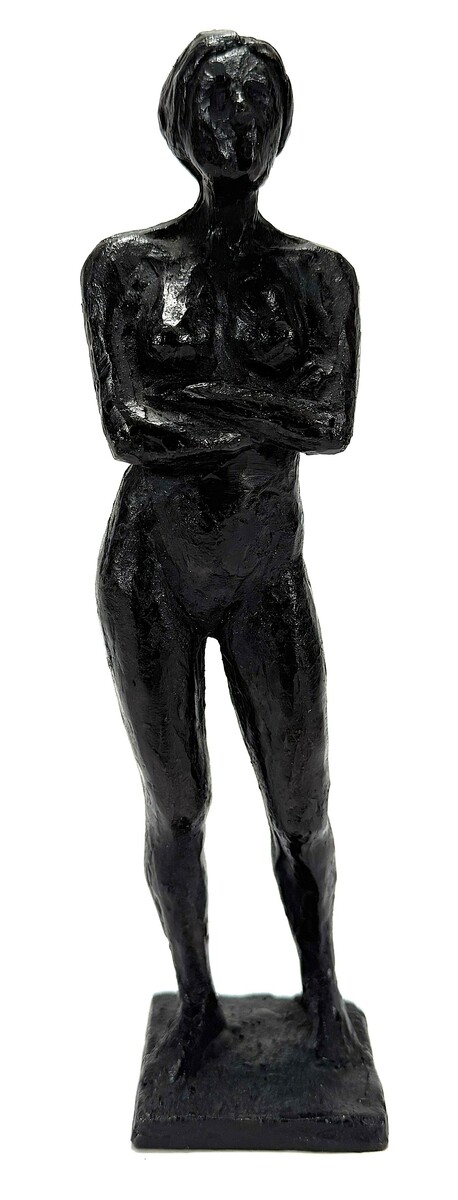Bronzen beeld van een staande, gestileerde vrouwelijke naaktfiguur met gekruiste armen, uitgevoerd in grof afgewerkt donkere patina. Gegoten via giettechniek met nabewerking, zonder zichtbare signatuur of merkregel. De stijl suggereert een moderne 20e-eeuwse oorsprong. De eenvoudige rechthoekige sokkel vormt een geïntegreerd element van de compositie.