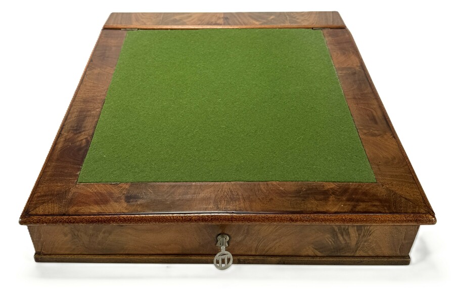 Mahoniehouten schrijfkist met groen vilten schrijfvlak, midden 19e eeuw, vermoedelijk Engels. De kist heeft een afgeschuinde vorm, scharnierend deksel en een binnenvak voor schrijfgerei. Aan de zijkant bevindt zich een kleine uittreklade met beenknop. Uitgevoerd in gefineerd mahonie met messing slotmechanisme, representatief voor vroege Victoriaanse schrijfkisten.