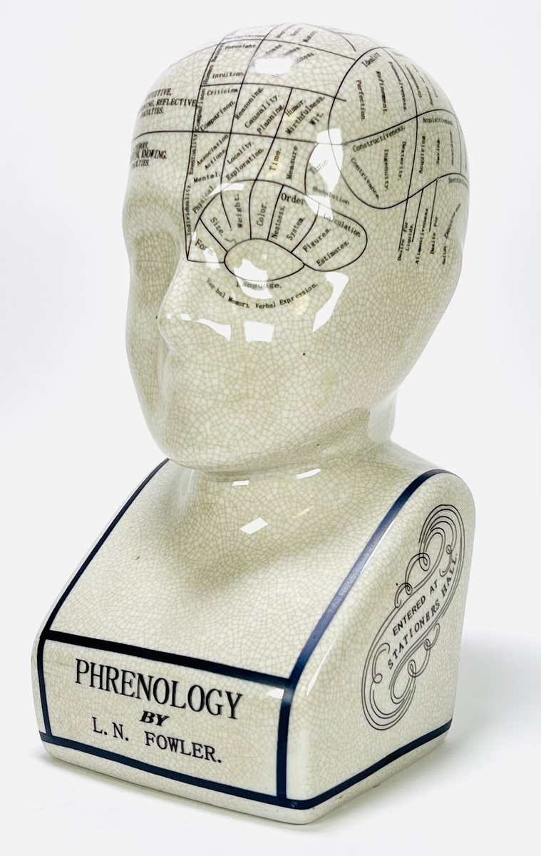 Keramische buste van een frenologiehoofd, gemerkt "Phrenology by L.N. Fowler", decoratieve reproductie uit de tweede helft van de 20e eeuw, uitgevoerd in craquelé geglazuurd aardewerk met transferdruk. De schedel toont een gedetailleerde kaart van mentale faculteiten en karaktereigenschappen. De buste is afgewerkt met blauwe biezen en bevat verklarende teksten op de rugzijde.