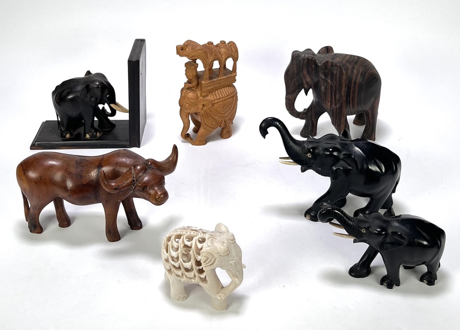Aziatisch figuratief snijwerk bestaande uit zes beelden en een boekensteun, daterend circa 1950–1980. De beelden zijn vervaardigd uit hardhout en steen door middel van handsnijwerk. Het kavel omvat meerdere olifanten, een buffel en een olifant met howdah. Een olifant is gesneden uit witte steen.