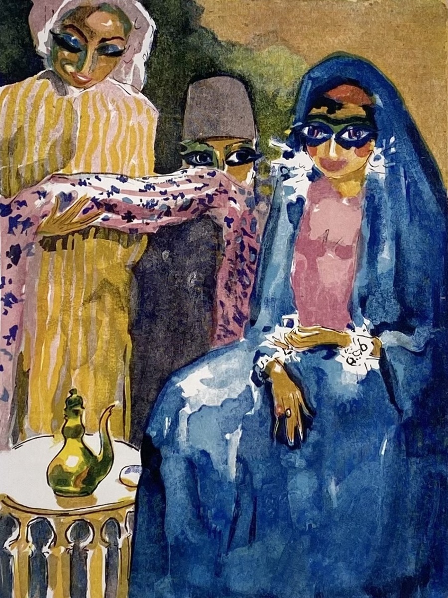 Kleurenhoutsnede op papier door Kees van Dongen (1877–1968), getiteld “La Femme au voile bleu”, gedrukt in 1955. De expressieve voorstelling toont drie figuren in oosterse gewaden met een centrale vrouw in blauw en warme accenten in geel en roze, typerend voor het fauvisme.