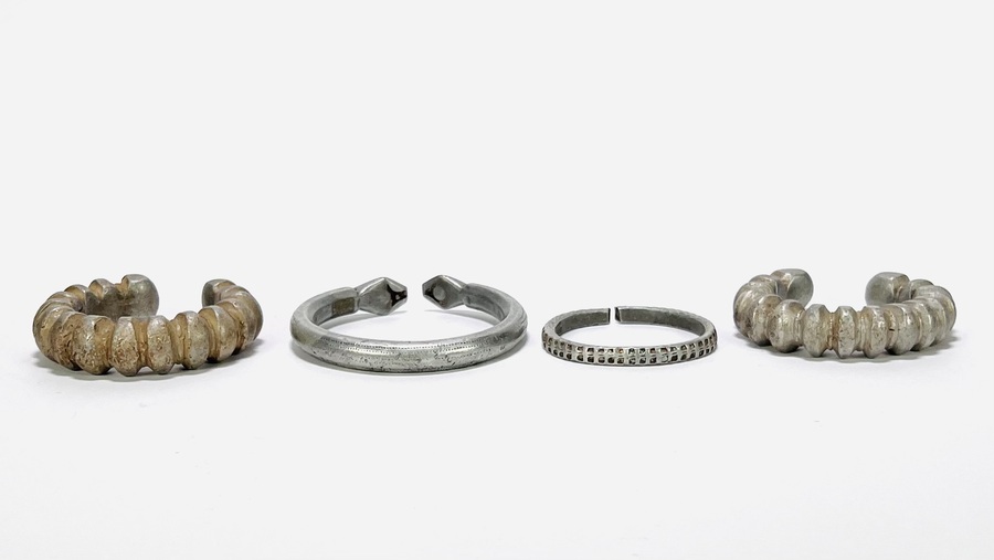 Vier tribale armbanden, vervaardigd uit een metaallegering door middel van gieten en ciseleren, daterend midden 20e eeuw. Het lot bevat twee massieve geribbelde armbanden, een gladde armband met gestileerde dierenkoppen en een smallere armband met vierkante perforaties.