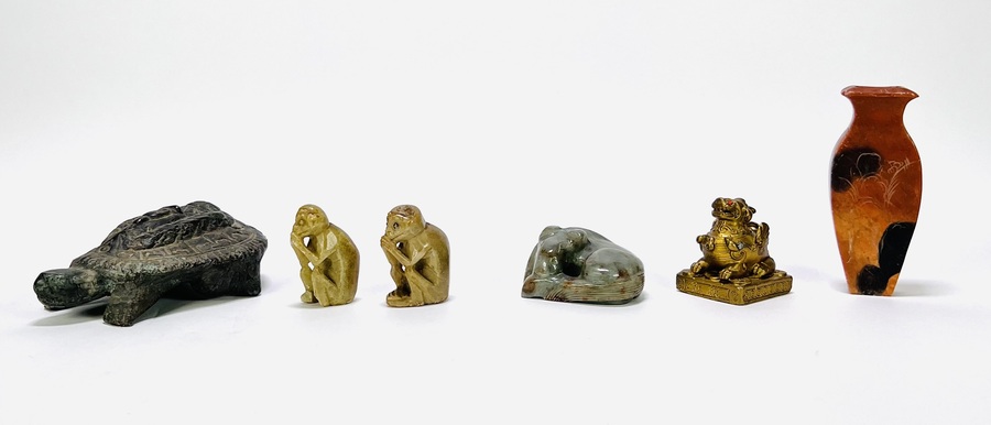 Lot Chinese curiosa bestaat uit zes objecten uit de periode circa 1900–1950, waaronder een bronzen schildpad en twee spekstenen apen in traditioneel Chinese stijl, vervaardigd door middel van gieten en handsnijwerk uit steen en metaal. Hierbij een liggend dier, een roodbruine steenvaas en een Foo dog.