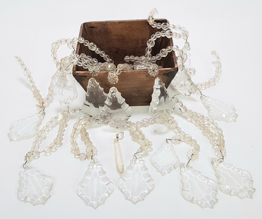 Kristallen kroonluchtpegels en kralensnoeren, daterend uit de periode circa 1880–1920. De pegels en kralen zijn vervaardigd uit helder glas door middel van slijpen en gieten. Het lot bestaat uit lange snoeren van gefacetteerde kralen, afgewisseld met grote, bladvormige pegels met een golvende rand.
