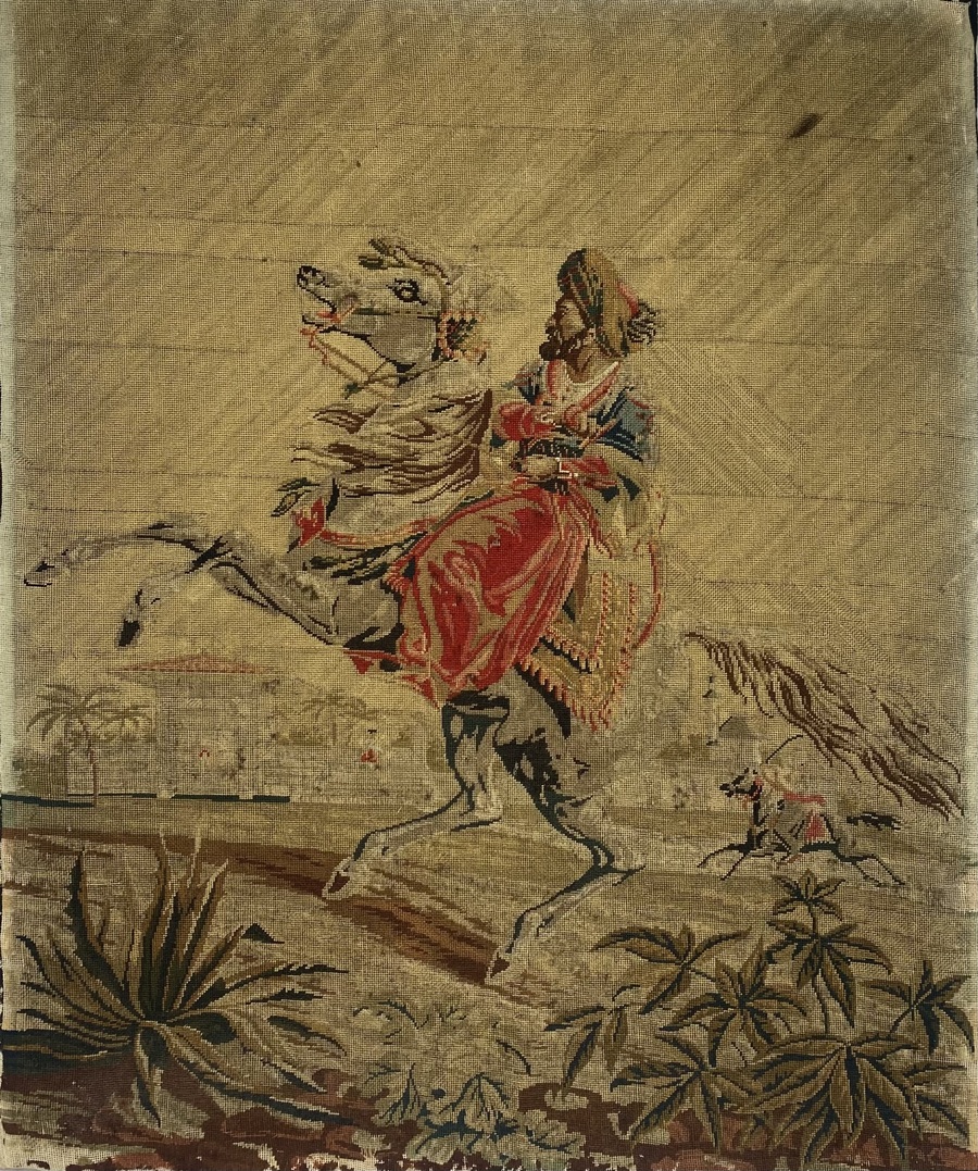 Wandtapijt van geweven textiel met een oriëntalistische voorstelling, daterend uit de tweede helft 19e eeuw. Het werk toont een ruiter te paard in traditionele kleding tegen een exotische achtergrond met palmbomen en architectuur.