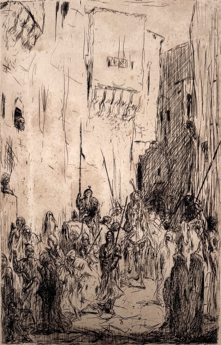Ets door Marius Bauer (1867–1932), een oosterse en religieuze voorstelling in impressionistische stijl, gedateerd circa 1900–1920. Het werk is uitgevoerd in diepdruk op papier met de droge naald techniek en toont een chaotische menigte in een stadsstraat.