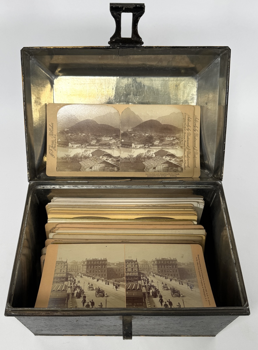 Metalen opbergkist met een grote collectie stereofoto’s, daterend circa 1880–1920. De stereokaarten zijn fotografische afdrukken gemonteerd op karton en omvatten onder meer stadsgezichten en landschappen. De Amerikaanse uitgevers van de kaarten zijn onder andere B. W. Kilburn en Underwood & Underwood.