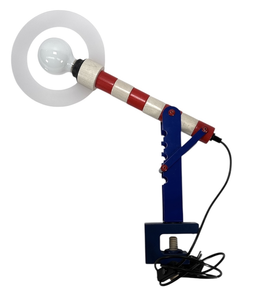 Klemlamp van HABA (Habermaaß GmbH), Duitsland, uitgevoerd in de Memphis Design stijl, gedateerd ca. 1980–1995. De lamp heeft een metalen klem en een verstelbare arm van gesegmenteerd en rood-wit geschilderd hout. De arm eindigt in een draaibare halodiffusor van plexiglas.