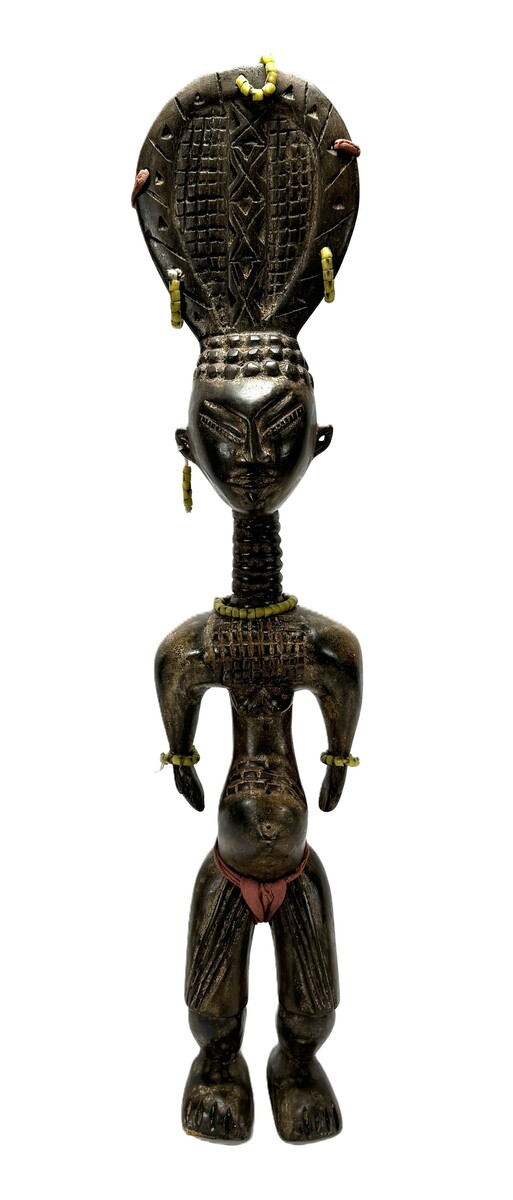 Gesneden houten Baule beeld (Ivoorkust) van een staande vrouwelijke figuur (blolo bla), daterend uit de tweede helft 20e eeuw, vervaardigd door middel van houtsnijwerk en heeft een typische Baule coiffure en gelaatstrekken. De figuur is gedecoreerd met glaskralen en draagt een donkere, glanzende patina, kenmerkend voor ritueel gebruik. De lange nek en de symmetrische, gestileerde vorm zijn representatief voor Baule voorouderbeelden.