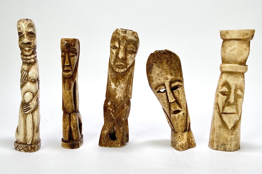 Vijf tribale beelden vervaardigd uit been, Centraal-Afrika. De figuren zijn langwerpig en gestileerd met typische kenmerken van de Kongo Vili of Yombe culturele traditie, waaronder een dubbelhoofdige voorstelling. Datering is circa midden 20e eeuw.