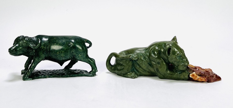Twee dierfiguren, een buffel en een roofdier, uitgevoerd in serpentijn. De sculpturen zijn naturalistisch geabstraheerd in een diepgroene kleur met een glanzende afwerking. Het roofdier heeft een contrasterende roodbruine prooi in de bek van calciet. De herkomst is Azië, circa tweede helft 20e eeuw.