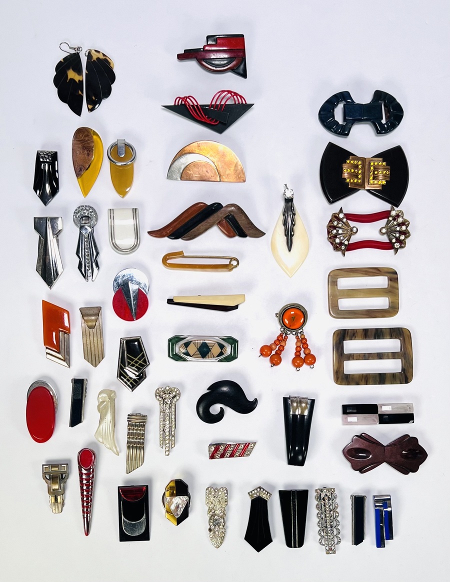 Vintage modeaccessoires waaronder spelden, gespen en broches. De collectie is uitgevoerd in kunststof en metaallegeringen, daterend midden 20e eeuw. De stijl is Art Deco tot retro modernisme, gekenmerkt door geometrische vormen en sterke kleurcontrasten.
