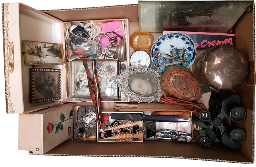 Verzameling curiosa in diverse stijlen en materialen, waaronder sieraden, een verrekijker, glaswerk en een ovaal portret in lijst, dateren uit de periode circa 1880 tot 1970. Het ensemble is van Europese herkomst en vervaardigd door middel van metaalgieten, glasslijpen en handsnijwerk.