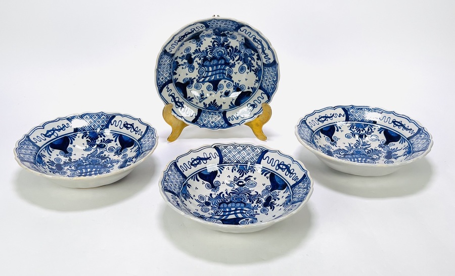 Vier wandborden uitgevoerd in handbeschilderd aardewerk in Delfts blauw, gedateerd circa 1880–1930. De wandborden zijn gedecoreerd met een centraal motief van een bloemenmand en gestileerde ornamenten op de geschulpte rand. Het decor is kobaltblauw onder het glazuur, een imitatie van het 17e-eeuwse Chinese porselein.