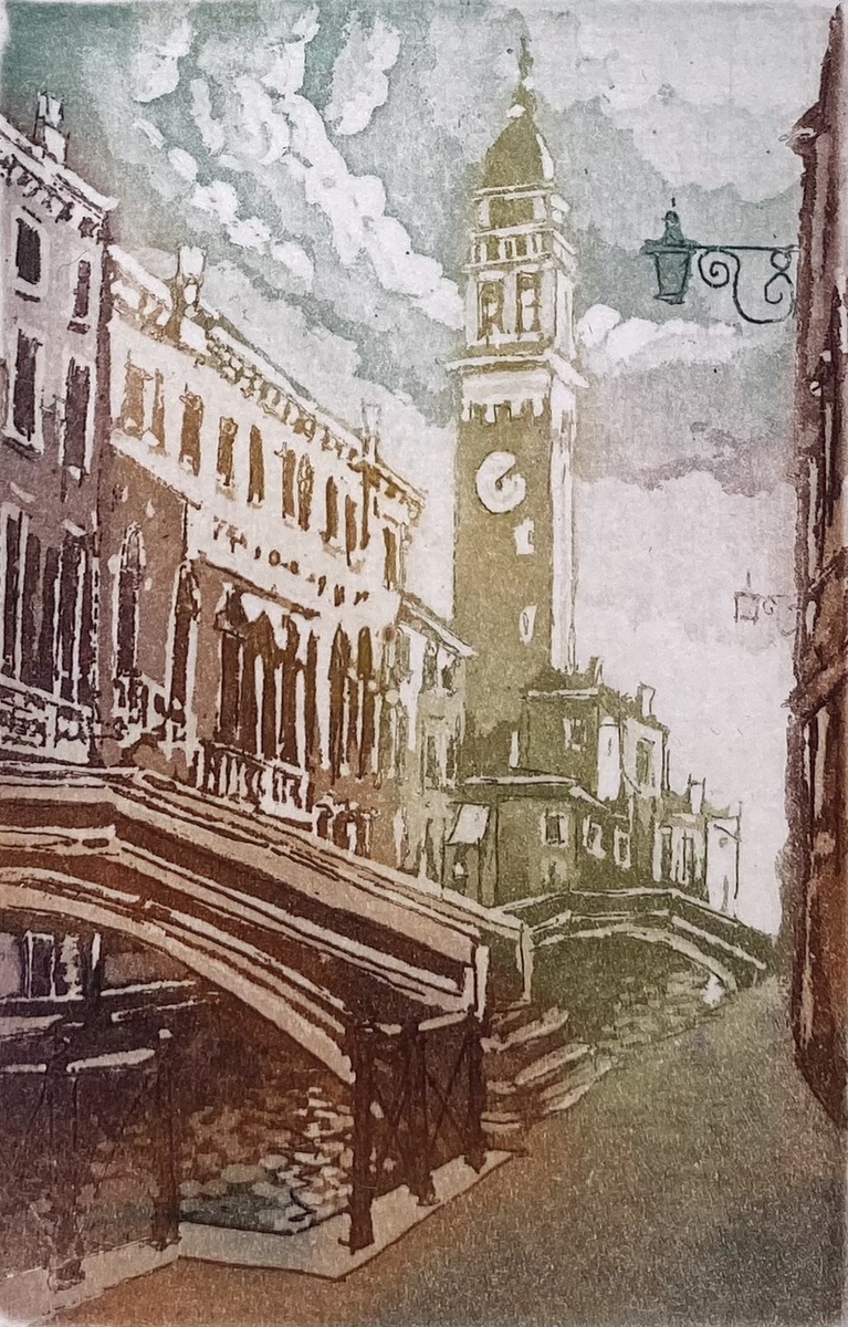 Handgekleurde ets op papier toont een stadsgezicht van Venetië met de brug der zuchten, in impressionistische stijl, daterend uit het midden van de 20e eeuw. Oplagenummer 18/25, onduidelijke signatuur rechtsonder.