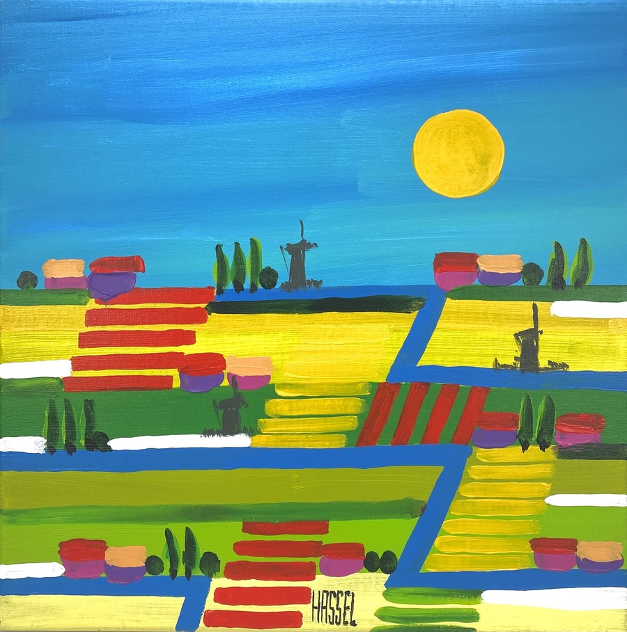 Schilderij op doek door Ad van Hassel (1953), acrylverf op doek, uitgevoerd in een fauvistische stijl. De voorstelling toont een gestileerd Nederlands landschap met felle kleurvlakken van rode, gele en groene velden, aangevuld met zwarte silhouetten van windmolens en cipressen tegen een felblauwe lucht. Gesigneerd midden onder “HASSEL”.