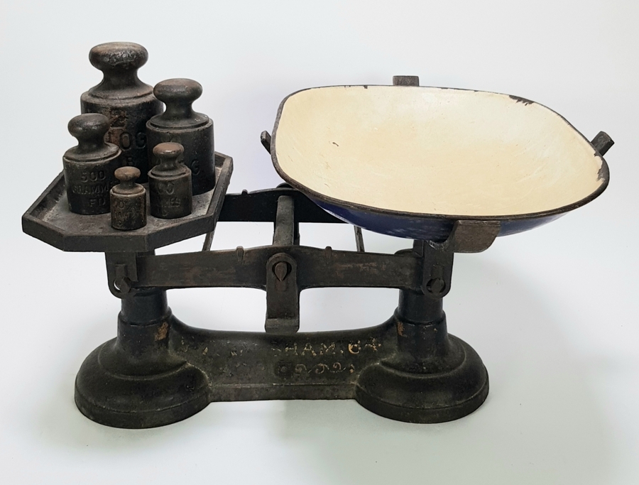 Gietijzeren platformweegschaal met bijbehorende gewichten uit West-Europa, uit het eerste kwart 20e eeuw. Het frame is gegoten en gelakt met in reliëf de markering 'CHAM. G. D.'. De ovale weegschaal is geëmailleerd, wit-beige aan de binnenzijde, en een set gietijzeren gewichten met gram en kilogram aanduidingen.
