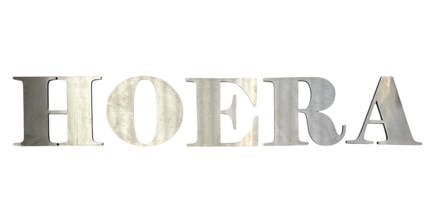 Vijf design gevelreclame letters die het woord "HOERA" vormen, gemaakt van roestvrij staal en kunststof, circa 2000–2025. De moderne letters zijn uitgevoerd in een strak sans-serif lettertype. Dit letters diende als driedimensionale winkelreclame.