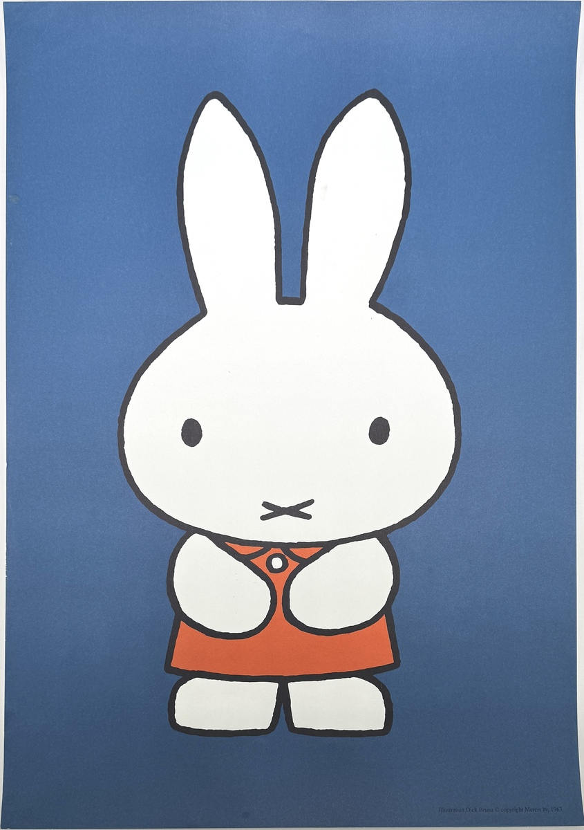 Poster van Dick Bruna (1927–2017), gedateerd 1963. De illustratie toont Nijntje en is uitgevoerd in offsetdruk, met een minimalistische compositie van primaire kleuren en dikke zwarte contouren tegen een blauwe achtergrond.