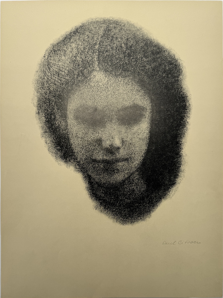 De reproductie uit circa 1960–1975 toont het portret van het “Joods Meisje” door Paul Citroen. De voorstelling is opgebouwd uit een pointillistisch raster dat een atmosferisch effect creëert in zwart-wit met korrelige textuur. De prent is gesigneerd in de plaat rechtsonder.