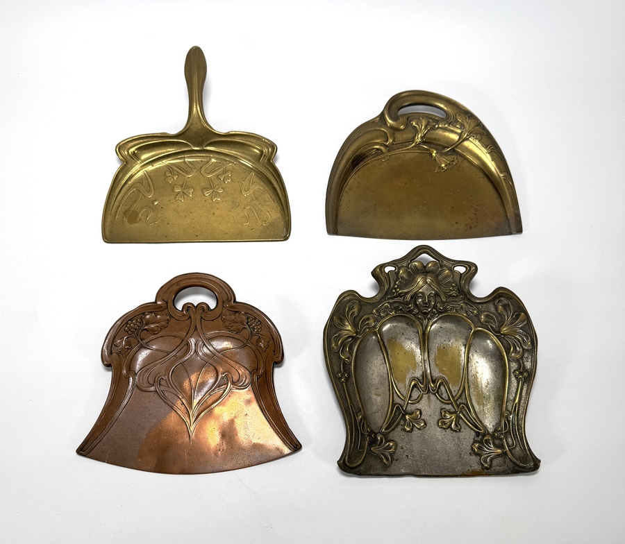 Kruimelschuifjes, vervaardigd uit koper en messing, daterend uit de Art Nouveau periode ca. 1890–1915, uitgevoerd met gegoten en geperste reliëfs. De decoratie bestaat uit organische, golvende lijnen en gestileerde florale motieven, in verschillende maten en decoraties.