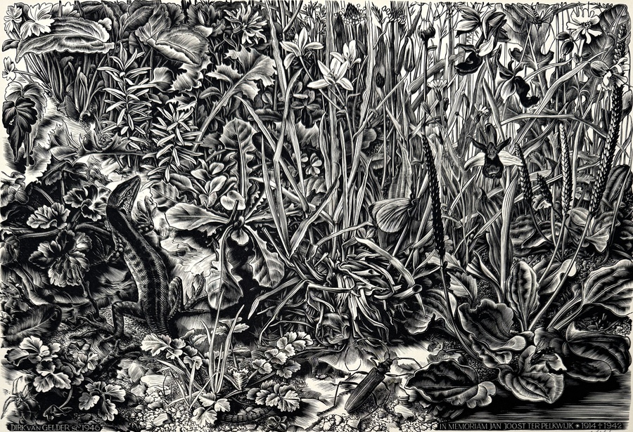 Houtgravure op papier van de graficus Dirk van Gelder (1900–1973), gesigneerd en gedateerd 1946. Het werk is uitgevoerd in figuratieve grafiek en toont een dichte, naturalistische weergave van een hagedis en insecten tussen de vegetatie. Met potlood rrechtsonder gesigneerd en verso in inkt titel en techniek. Het is een herdenkingsprent "In Memoriam Jan Joost ter Pelkwijk" en is gedrukt in scherpe zwart-wit contrasten.