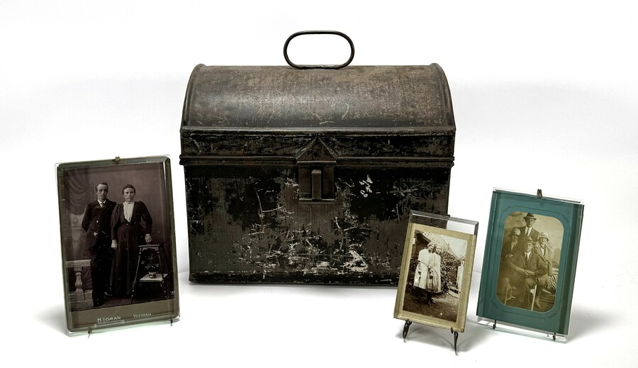 Blikken kist met een collectie draadstalen fotolijstjes, een foto gesigneerd H. Loman, Veendam. De kist is uitgevoerd in een utilitaire stijl. Datering circa 1890 – 1920.