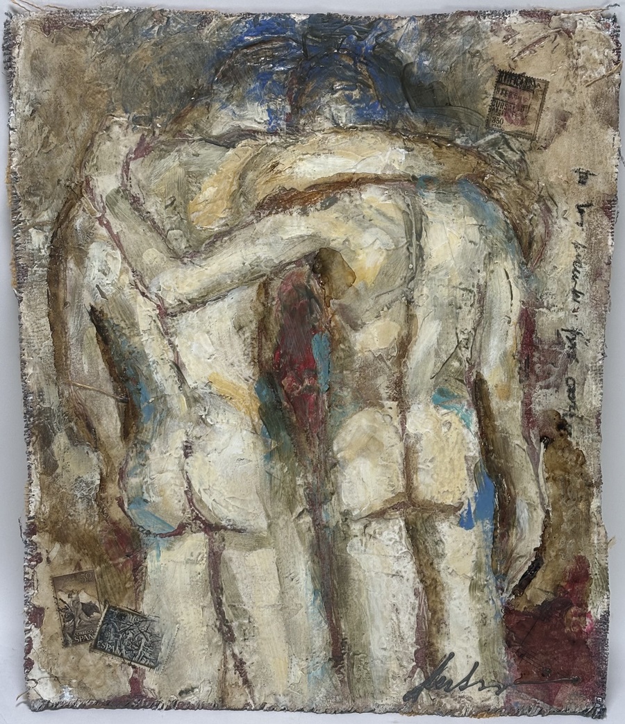 Olieverf in mixed media op grof linnen doek door Andrés, getiteld “Ellos” en gedateerd 2006. In abstract-expressionistische stijl toont het schilderij overlappende menselijke figuren in rug aanzicht met aardse kleuren en accenten in rood en blauw. Het werk bevat collage-elementen zoals postzegels. Rechtsonder gesigneerd “Andrés” en vergezeld van een handgeschreven verklaring op de achterzijde.