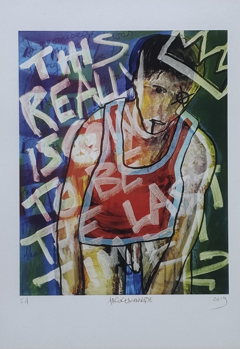 Kleurrijke grafische druk op papier door A BROKEN UNIVERSE (een Ecuadoraanse kunstenaar, gevestigd in Nederland) met tekst “This really is going to be the last time”, 2019. In expressionistische stijl met invloeden van Street Art. Gesigneerd en gedateerd in potlood, ingelijst in een moderne witgelakte lijst.