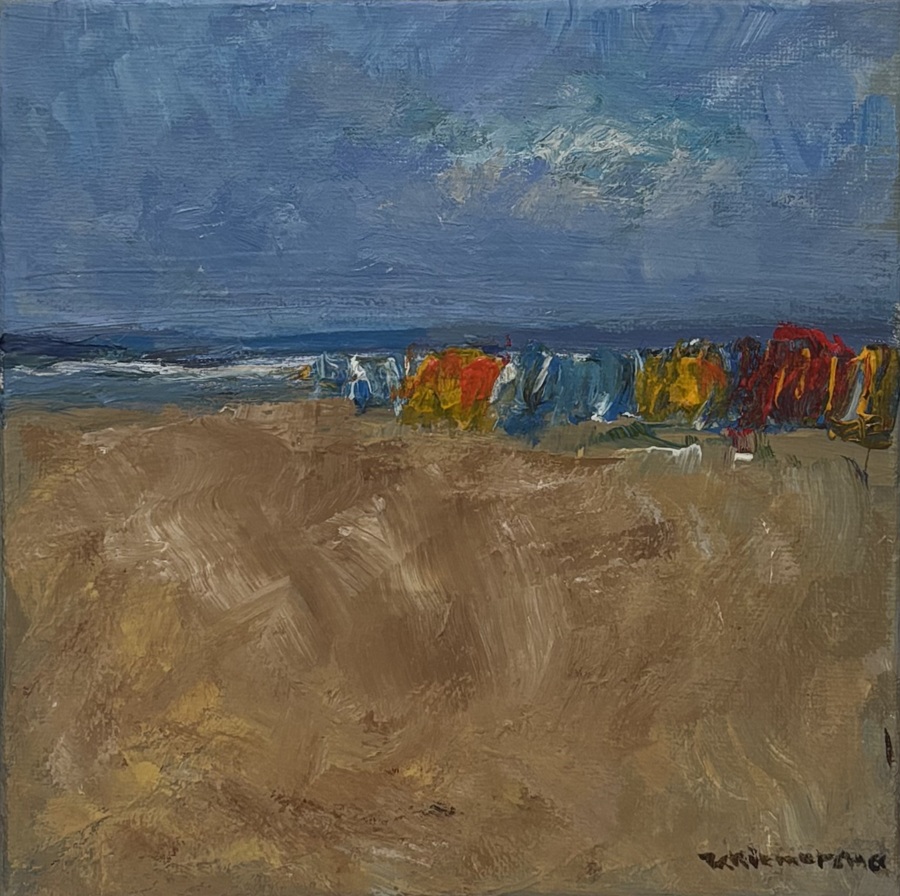 Schilderij, olieverf op doek, onduidelijk gesigneerd rechtsonder, tweede helft van de 20e eeuw. Het expressionistische strand tafereel toont een strand met op de achtergrond een rij felgekleurde windschermen in rood, geel en blauw langs de kust. Het werk bevindt zich in een zilverkleurige lijst.
