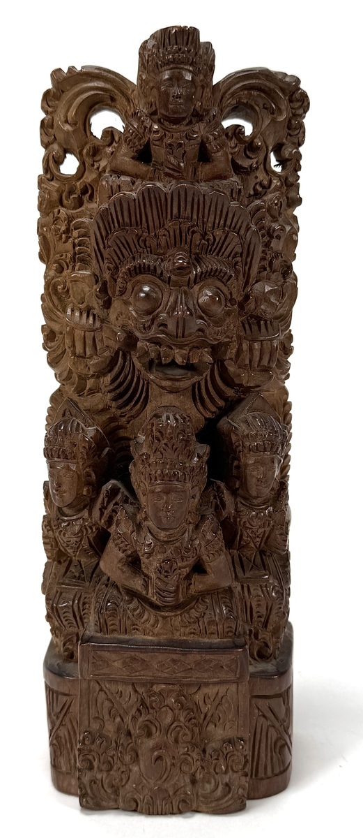 Balinees houten beeld, eerste helft 20e eeuw, Indonesië, uitgevoerd in traditioneel houtsnijwerk. Te zien zijn een centrale Barong-achtige figuur met grotesk gelaat en tanden, omringd door meerdere mensfiguren in ceremoniële houdingen met hoofdtooien. De achterzijde is versierd met gestileerde bladmotieven. Het beeld is vervaardigd uit tropisch hardhout en toont kenmerkende Balinese iconografie.
