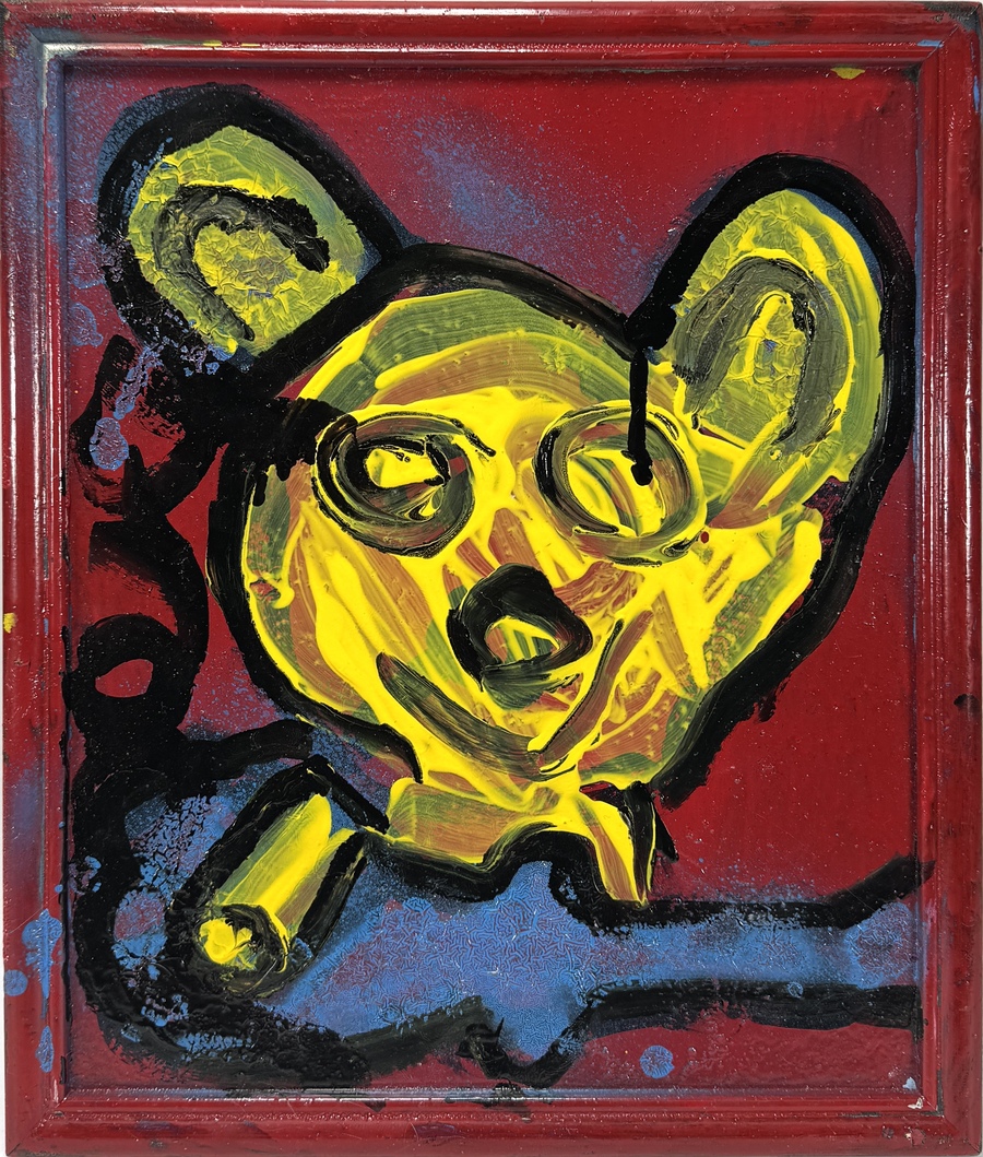 Acrylverfschilderij in een expressieve stijl naar Herman Brood, eind 20e eeuw. Voorstellend een dierfiguur in geel en zwart op rode achtergrond met blauwe accenten, uitgevoerd in acryl op paneel met geïntegreerde omlijsting en fluwelen achterkant. De techniek kenmerkt zich door dikke verfstreken en zwarte, grove contouren, met een eenvoudige rode lijst.