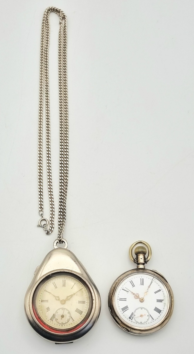Twee zakhorloges, een zilveren exemplaar (800/1000) en een onedele uitvoering met ketting, beide met inscriptie “Cylindre 6 Rubis”, eind 19e eeuw, Zwitserland. Beide horloges met emaille wijzerplaat en Romeinse cijfers, voorzien van gegraveerde achterzijden, één met paardendecor. De uurwerken zijn van het type remontoir, handmatig opwindbaar met sleutelvrije kroon.