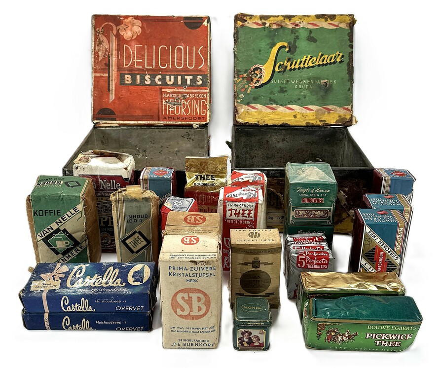 Twee lithografisch bedrukte blikken, daterend uit circa 1930-1950, van de Nederlandse merken Meursing en Schuttelaar. De blikken bevatten diverse kartonnen verpakkingen van historische Nederlandse merken zoals Van Nelle en Douwe Egberts (thee, koffie, meel, cacao etc.).