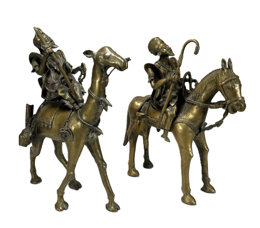 Twee groot formaat bronzen beelden tonen ruiterfiguren: één op een paard, één op een kameel, en zijn vervaardigd via lost-wax gieting in brons met natuurlijke patina. De figuren dragen sierkledij, hoofdtooien en houden stafachtige attributen vast. De beelden dateren uit de 20e eeuw, West-Afrikaanse herkomst.