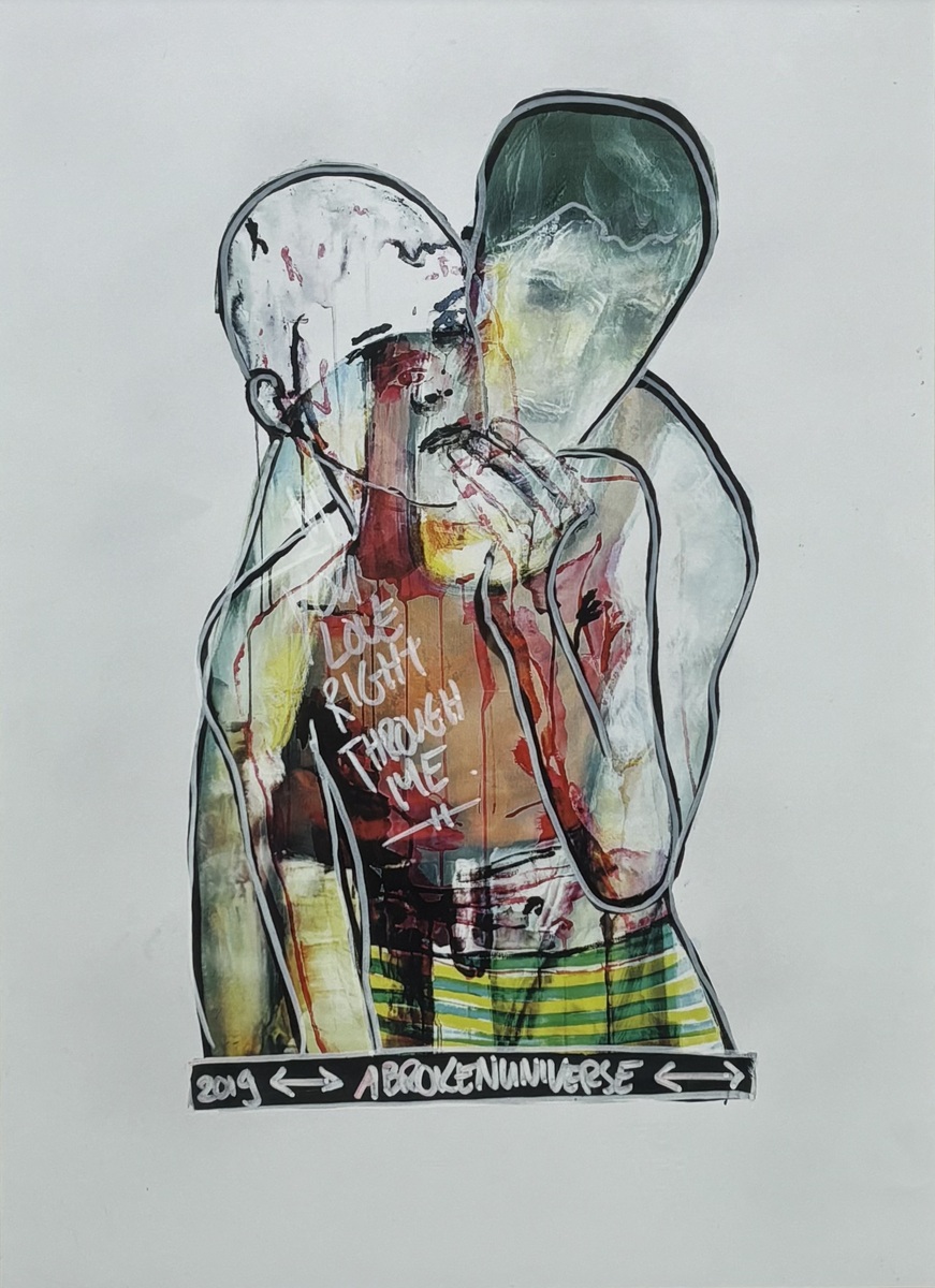 Gemengde techniek op papier, een expressief werk uit 2019, door A BROKEN UNIVERSE (Ecuadoraanse kunstenaar, gevestigd in Nederland). Afbeelding van twee abstracte emotioneel geladen figuren, bewerkt met dikke verfstreken en de handgeschreven tekst "YOU LOVE RIGHT THROUGH ME". Het werk combineert invloeden uit Street Art en Expressionisme en is voorzien van de signatuur en datering in de onderrand.