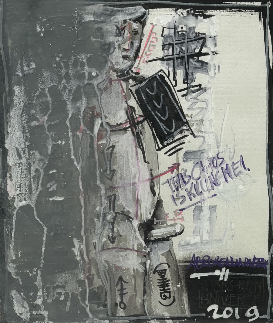 Acrylverfschilderij op doek, een expressief Urban Art werk uit 2019 door kunstenaar A Broken Universe (een Ecuadoraanse kunstenaar, gevestigd in Nederland). Het toont een abstract-figuratieve voorstelling, gedomineerd door grijze en witte verflagen, met graffiti-achtige symbolen en de expliciete tekst "THIS CHAOS IS KILLING ME!" in paars.