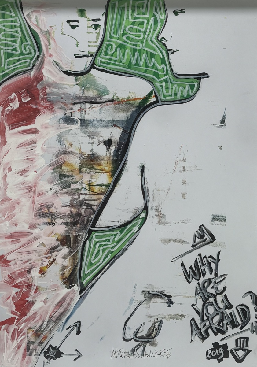 Gemengde techniek op papier door A BROKEN UNIVERSE (Ecuadoraanse kunstenaar, gevestigd in Nederland), gedateerd 2019. Het werk toont twee gestileerde figuren met groene patronen en de tekst “Why Are You Afraid?” in expressieve letters, uitgevoerd in acrylverf en marker. Typerend voor de hedendaagse urban popart stijl, voorzien van witte lijst. Midden onder gesigneerd.