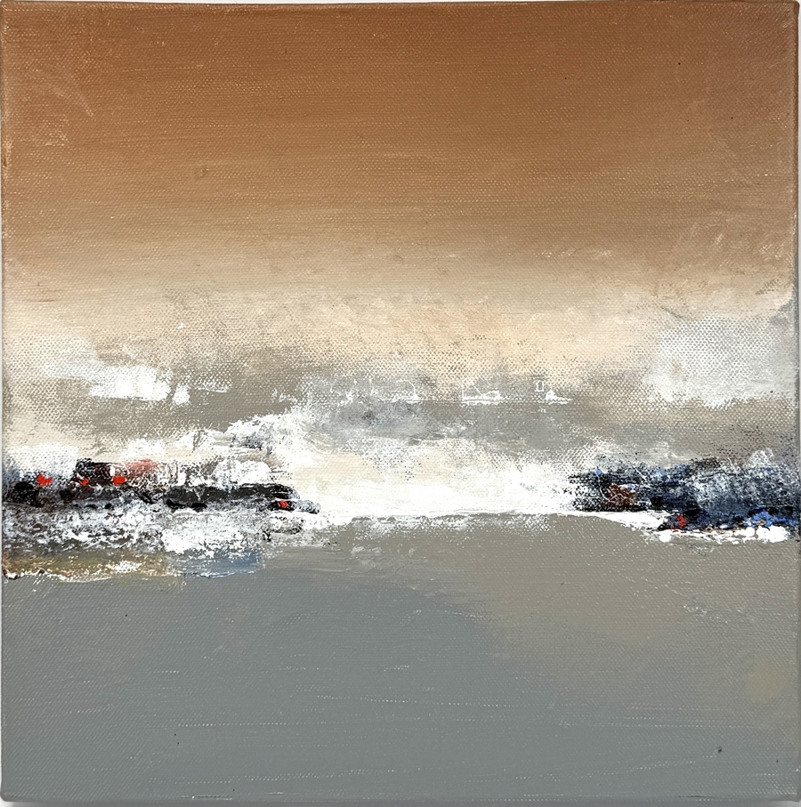Acrylverfschilderij op linnen doek door de Nederlandse kunstenaar Bart van Oijen (1949). Het abstract expressionistische werk toont een landschap in aardetinten bruin, grijs en wit met blauwe en rode accenten. De schildertechniek kenmerkt zich door een lyrisch abstracte stijl en een ruwe pasteuze verfapplicatie. Het werk is gesigneerd op de rechterzijkant.