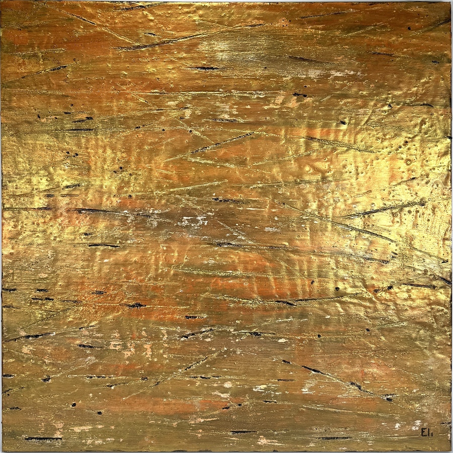 Abstract schilderij uitgevoerd in gemengde techniek met acrylverf en metaalpigmenten op paneel door de Italiaanse kunstenaar Elisa Sanacore. Het werk uit 2016 heeft de titel "The wounded Earth", en kenmerkt zich door een lyrisch abstracte stijl. Rechtsonder gesigneerd: Eli, en verso getiteld, gesigneerd en gedateerd.