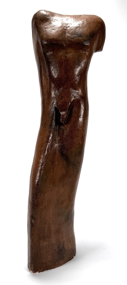 Abstract keramiek beeld van een torso, handgevormd uit klei en afgewerkt met een glanzend bruin glazuur. De holle sculptuur kenmerkt zich door een modern abstracte stijl met minimalistische, vloeiende lijnen. Dit ongesigneerde werk met organische vormgeving dateert uit de tweede helft 20e eeuw en is van Europese herkomst.